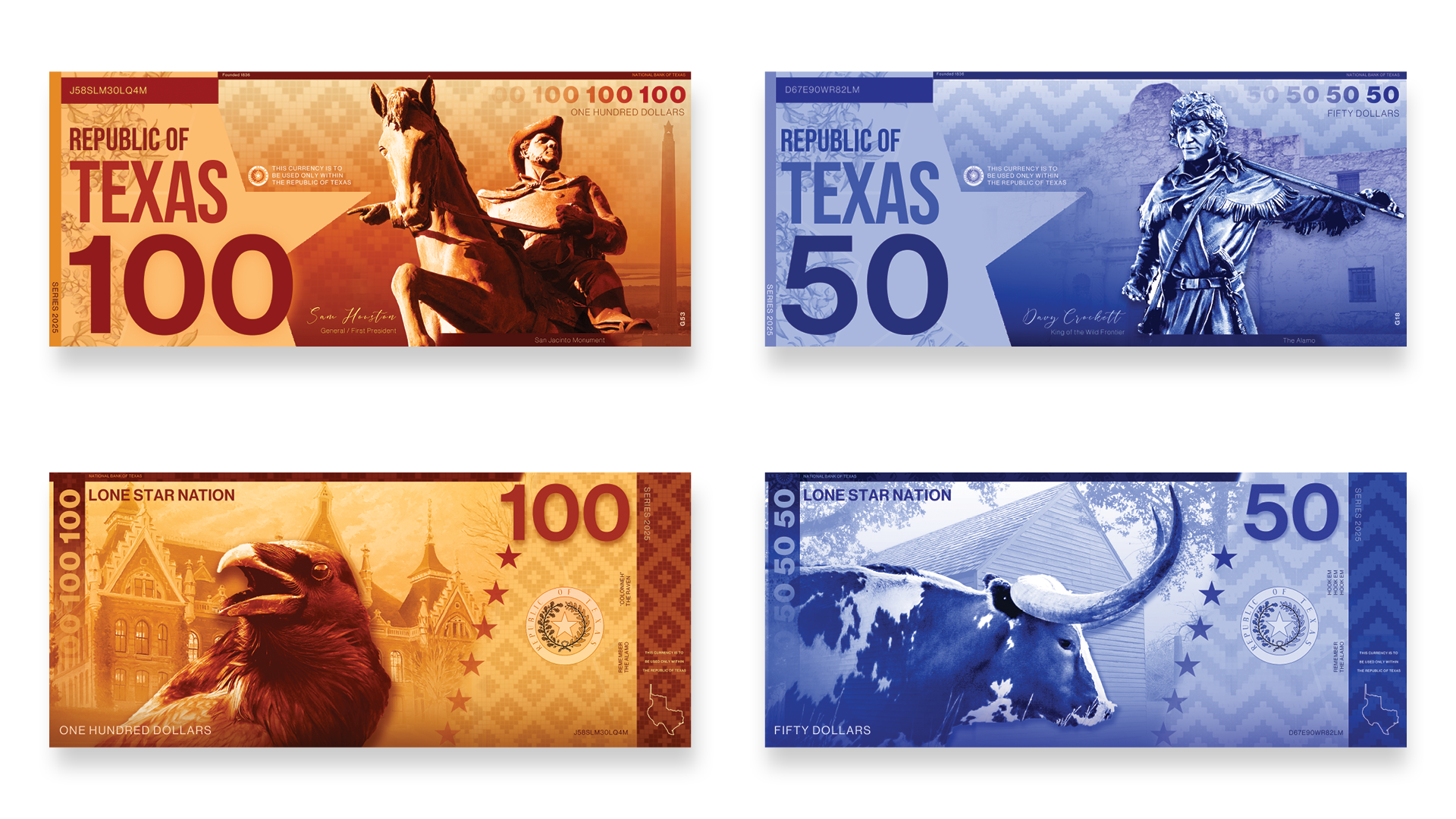 These banknote designs imagine currency for a scenario where the Republic of Texas remained an independent nation. Historical symbols of Texas are featured, celebrating its history and its founders. Leaders during the Texas Revolution such as Sam Houston and Davy Crockett are featured on $100 and $50 currency respectively. Monuments and buildings associated with them are also featured as well as national animals of Texas.