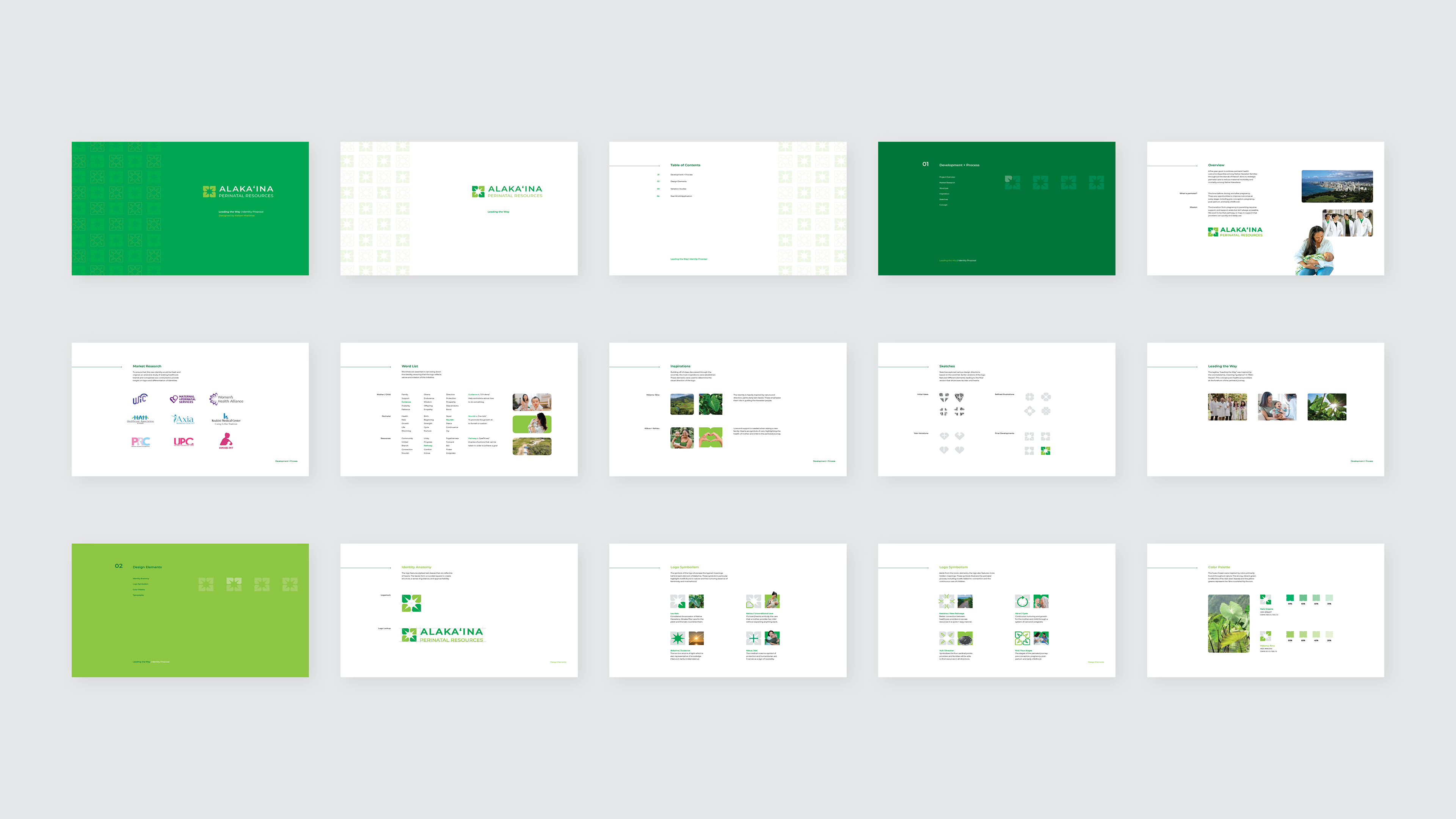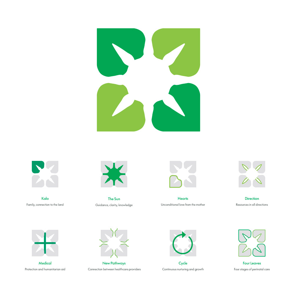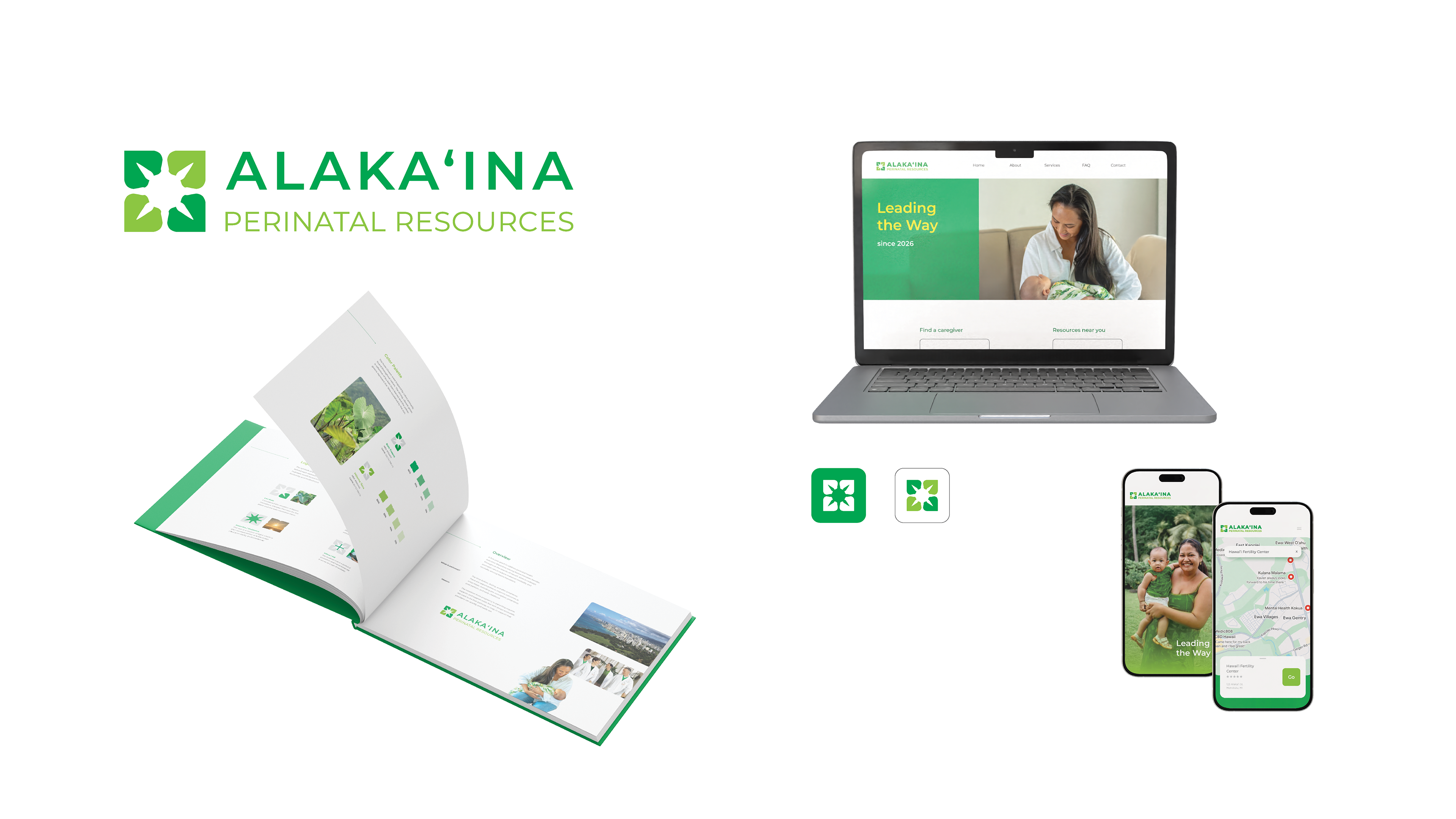 Alaka‘ina Perinatal Resources is a proposed identity for a five-year grant that seeks to address perinatal health outcome disparities among Native Hawaiian families. I created a logo inspired by nature and nurturing care, represented by kalo leaves and hearts. These symbols reflect the project's goal of creating the pathway or map for healthcare providers, guiding those in need to resources quickly and easily.