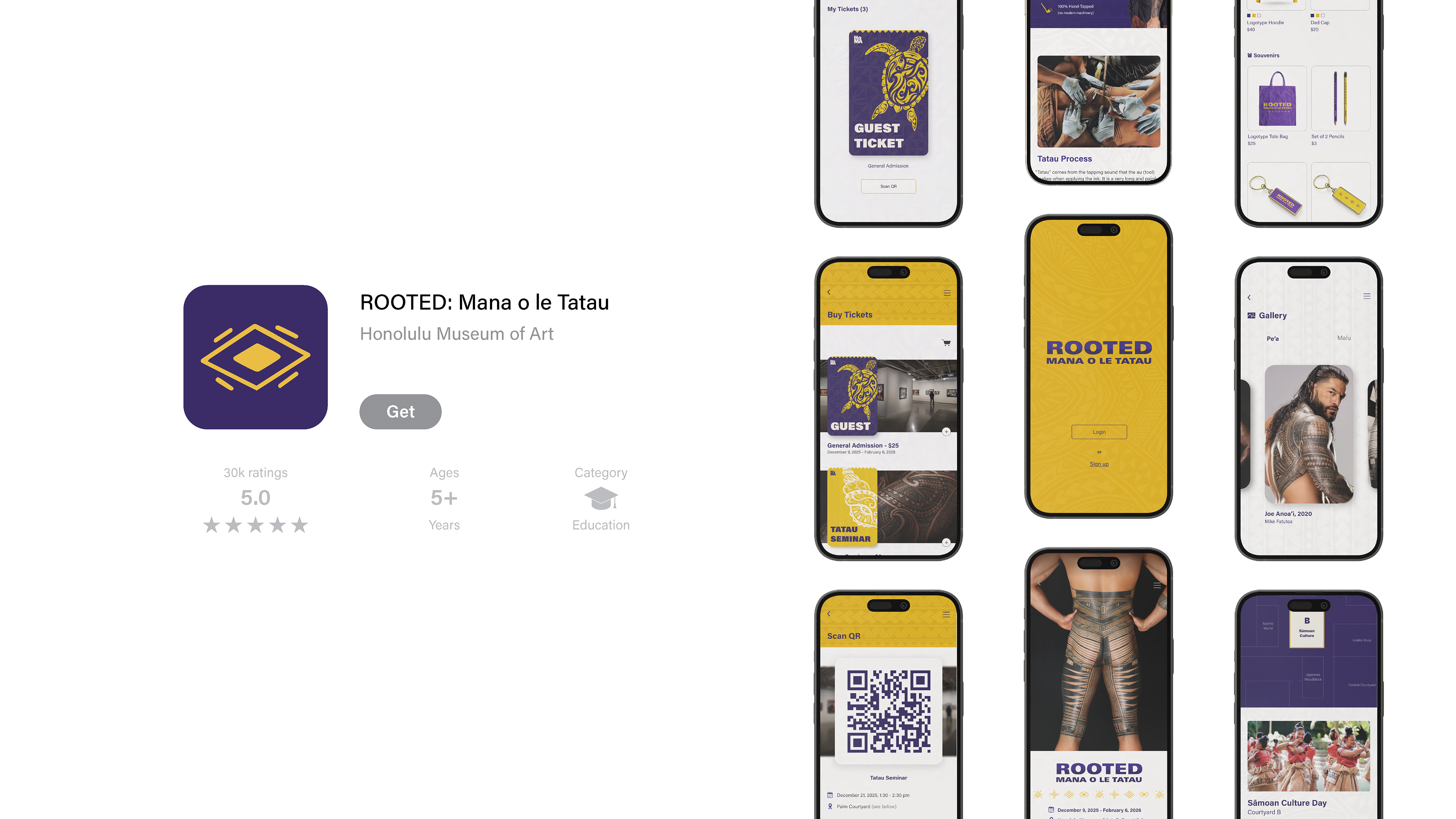 Alongside physical "ROOTED: Mana o le Tatau" exhibition materials, an interactive museum app was prototyped. While patrons walk through the museum, they can access their tickets, learn more about the origins of le tatau, register for learning experiences, communicate with other patrons through a community page, and more.